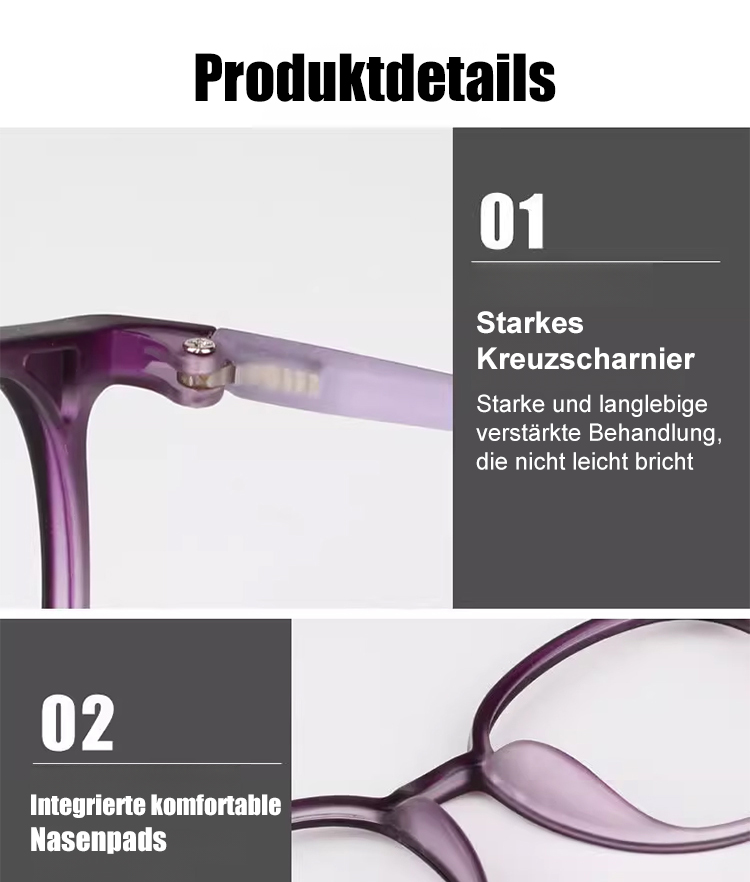 Kein Sehtest erforderlich, die Brille passt sich automatisch Ihren Sehbedürfnissen an und bietet klare Sicht sowohl in der Nähe als auch in der Ferne. Der Rahmen wiegt nur 7 Gramm, ist bequem zu tragen und passt zu jeder Gesichtsform!